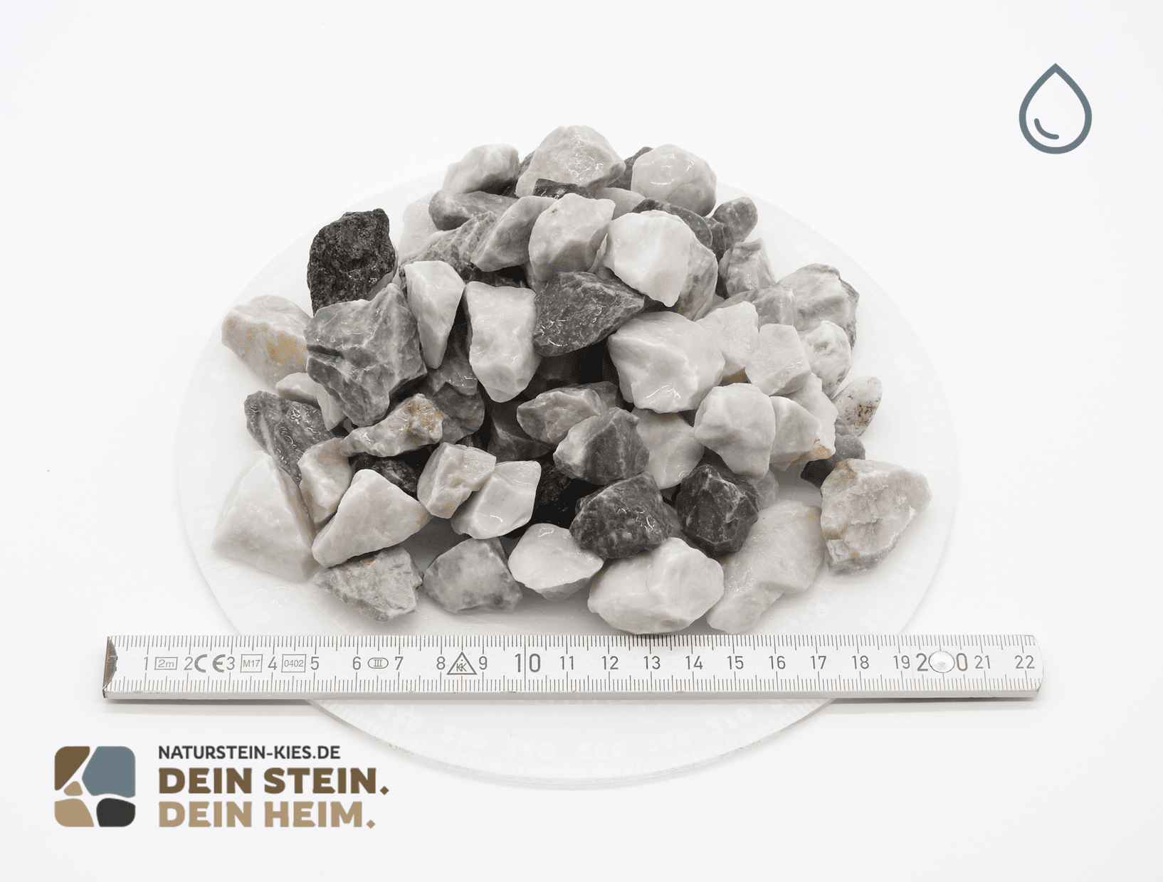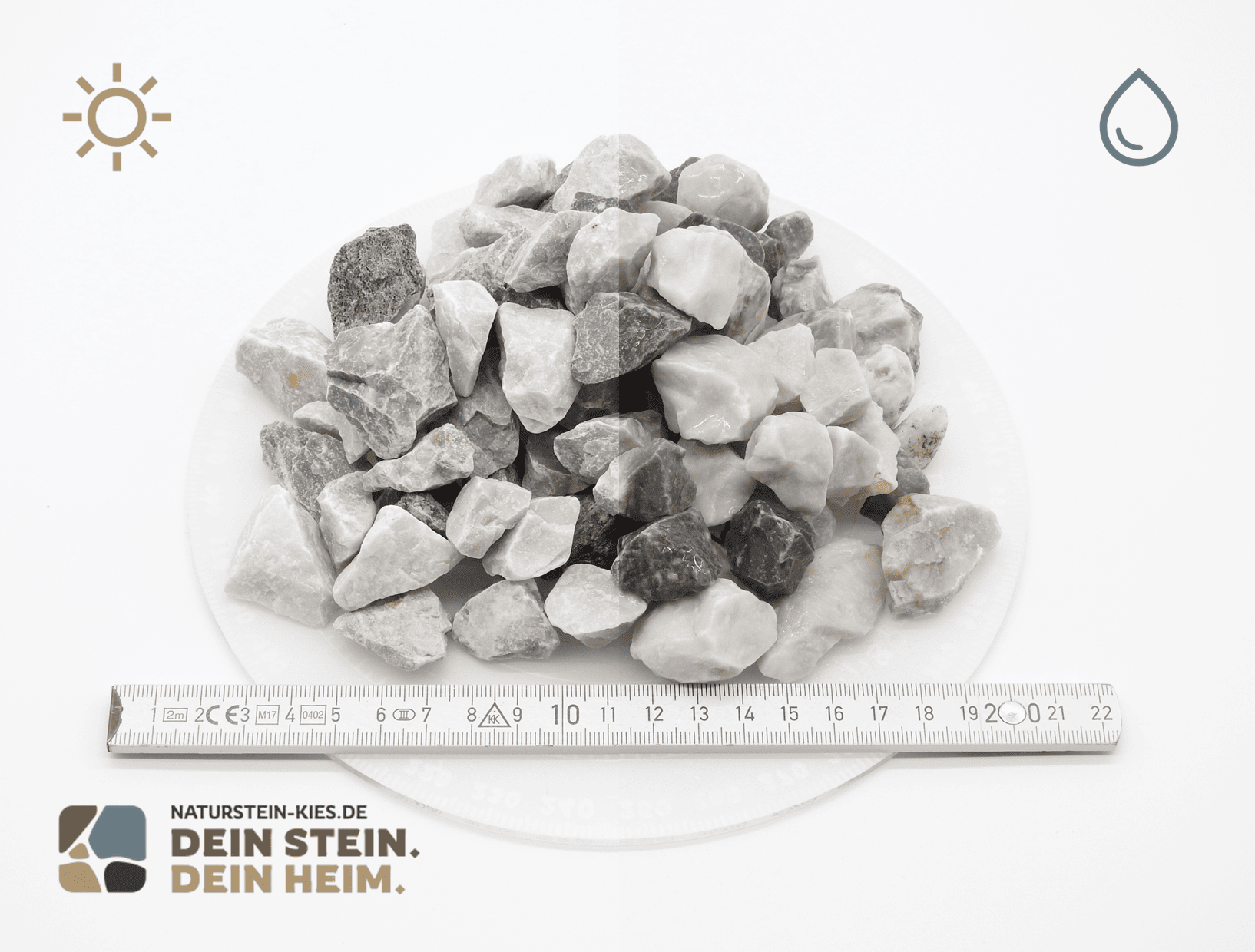 Schüttgutprodukte, wie beispielsweise Kies oder Splitt, werden oft in ihrer natürlichen Form angeboten. Diese Materialien sind in der Regel nicht gewaschen und können Anteile von Unter- und Überkorn sowie Gesteinsstaub enthalten. Daher empfehlen wir, das Material vor der Verwendung mit Wasser abzuspritzen, um unerwünschte Staubpartikel zu entfernen und die Sichtbarkeit der Farben zu verbessern.
