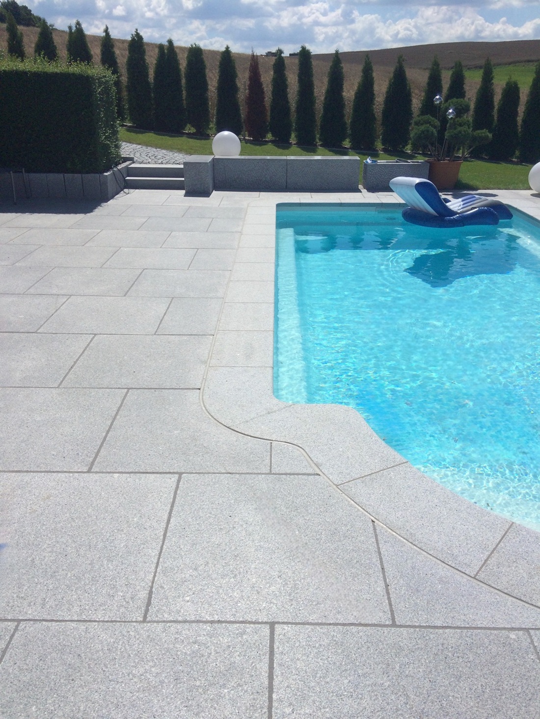 Entdecken Sie die eleganten grauen Granit Bodenplatten, die sich durch eine schöne, gleichmäßige Struktur auszeichnen. Die Oberseite dieser Platten ist gesägt und geflammt, was nicht nur für eine ansprechende Optik sorgt, sondern auch eine rutschfeste Oberfläche bietet. Dies macht die Platten ideal für verschiedene Anwendungen im Außenbereich.