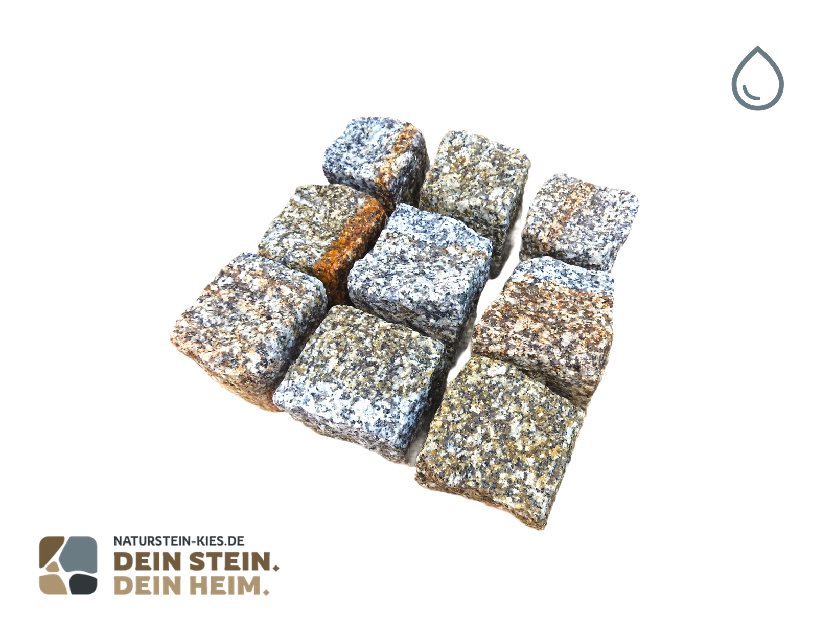 Die charakteristische Musterung des Granits resultiert aus Anteilen von Quarz, Feldspat und Glimmer. Mit einer Maße von ca. 8 – 11 cm bieten die Pflastersteine eine produktionsbedingte Maßtoleranz von durchschnittlich 1,5 - 2 cm. Diese Unregelmäßigkeiten sind kein Nachteil, sondern tragen zu einem natürlichen und lebendigen Erscheinungsbild bei, besonders bei Segmentbögen, wo unterschiedliche Größen notwendig sind, um kleine Fugen zu gewährleisten.