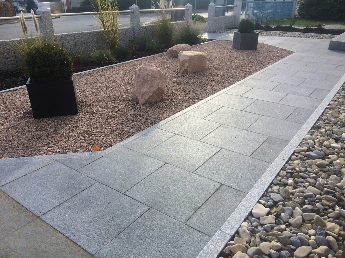 Um Ihr Gartenbild abzurunden, bieten wir passende Naturstein-Terrassenplatten, Palisaden/Stelen und Pflastersteine an, die sich harmonisch kombinieren lassen.