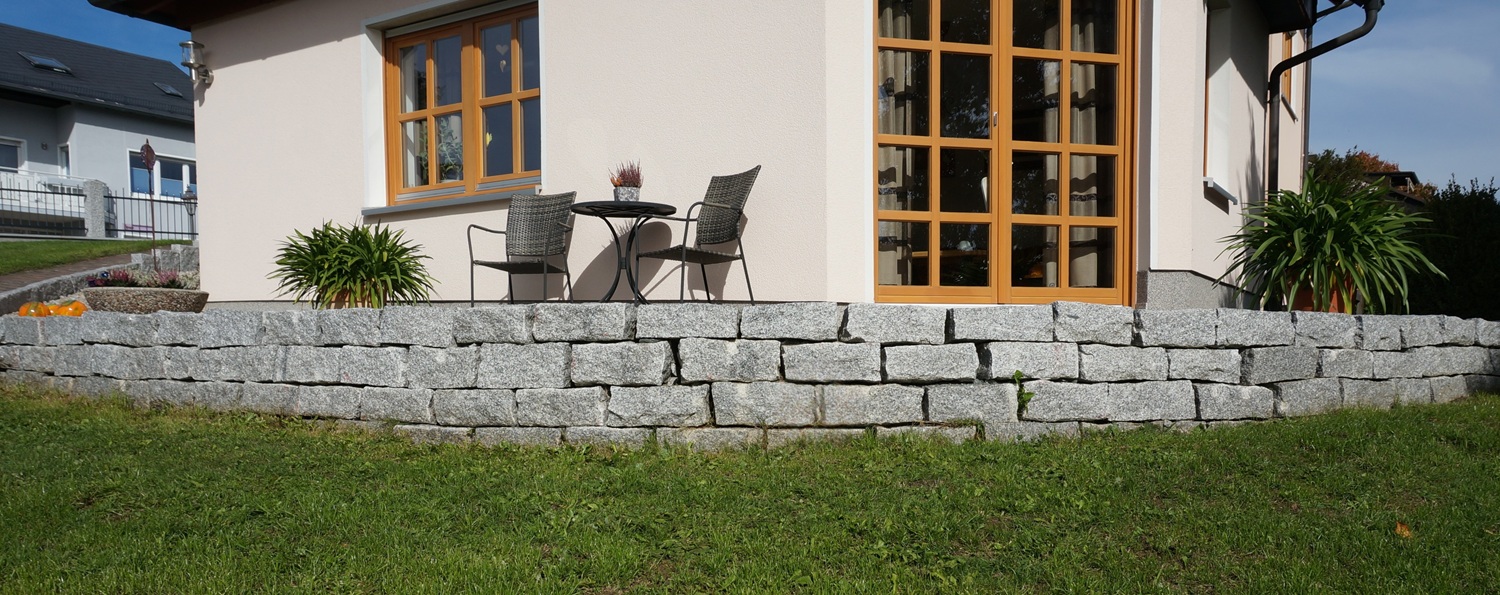 Wir empfehlen die Verwendung dieser Mauersteine vorzugsweise als einschichtiges Mauerwerk, um ein harmonisches und natürliches Erscheinungsbild zu gewährleisten. Aus Stabilitätsgründen sollte die Mauer nicht freistehen, sondern entweder trocken oder mit Mörtel bzw. Splitt zum Ausgleichen der Steine zur Mauer verarbeitet werden. Dabei ist ein Versatz der Fugen zu beachten und die leichte Hangneigung der Mauer zu berücksichtigen. Die typische Granitmusterung – entstanden durch Anteile aus Quarz, Feldspat und Glimmer, dies sorgt für ein ansprechendes Gesamtbild.