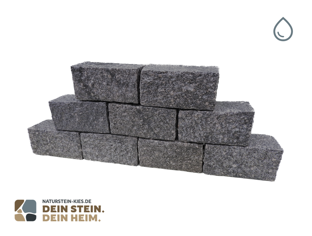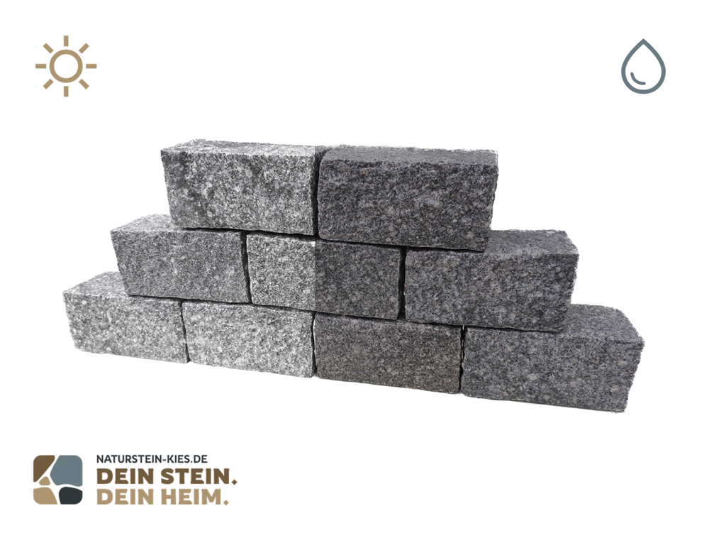 Unsere grauen Granit Mauersteine mit allseitig gespitzter Oberfläche bieten eine gleichmäßige Verarbeitungsqualität durch sehr geringe Maßtoleranzen. Erhältlich in den Größen ca. 40/20/20, 40/20/15, 35/17/15 oder auf Anfrage in anderen Dimensionen, sind diese Steine ideal für kreative Bauprojekte.