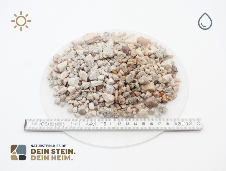 Mit hervorragenden Eigenschaften wie Druckbeständigkeit und Witterungsresistenz ist dieser Splitt optimal für dekorative Wege geeignet. Helle Materialien sind besonders für sonnige Bereiche zu empfehlen, da sie das Wachstum von Moos minimieren.
