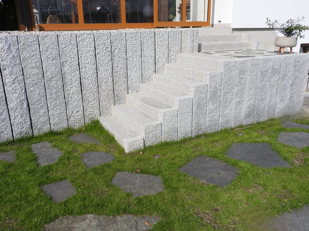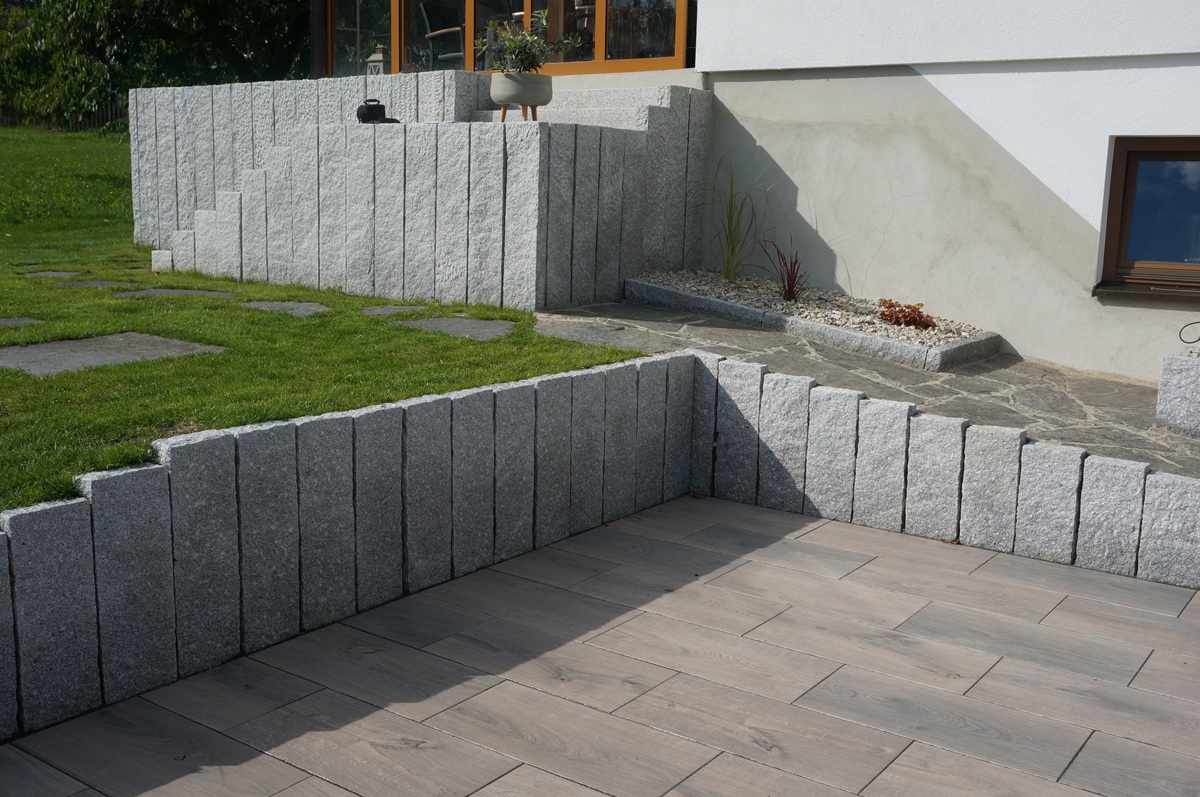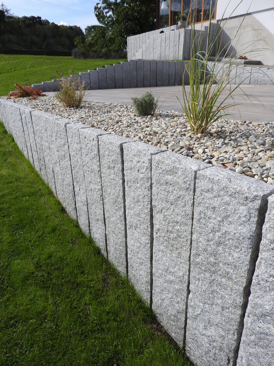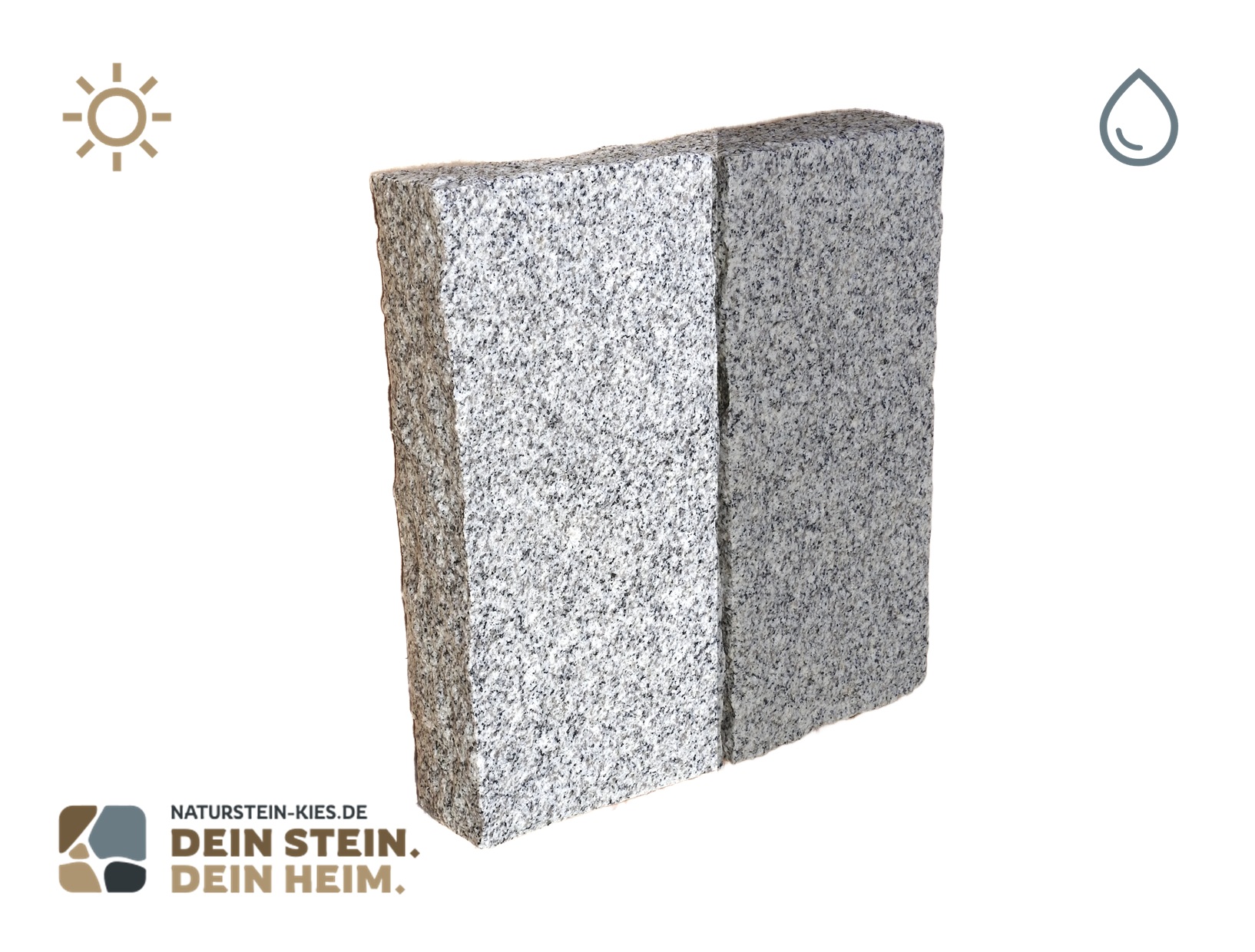 Mit einer Stärke von 10 cm bieten unsere Granit Stelen eine hohe Stabilität, die gerade bei längeren Abmessungen (bis zu 300 cm) vorteilhaft ist. Dank der robusten Verarbeitung können sie sowohl als Hochbeet Einfassung als auch als Treppenbau genutzt werden. Sie eignen sich perfekt für den hochkanten Bau und sind eine ästhetische Lösung für Beete, Terrassen und Einfahrten. Bei der gespitzten Bearbeitung kann es vorkommen, dass ein geringer Teil einer Fläche etwas tiefer ausbricht. Dies liegt daran, dass das Material zunächst gespalten und anschließend nachbearbeitet/gespitzt wird. Der Prozess des Spitzens sorgt für eine gleichmäßigere Oberfläche und geringen Fugen bei dem aneinander stellen der Stelen.