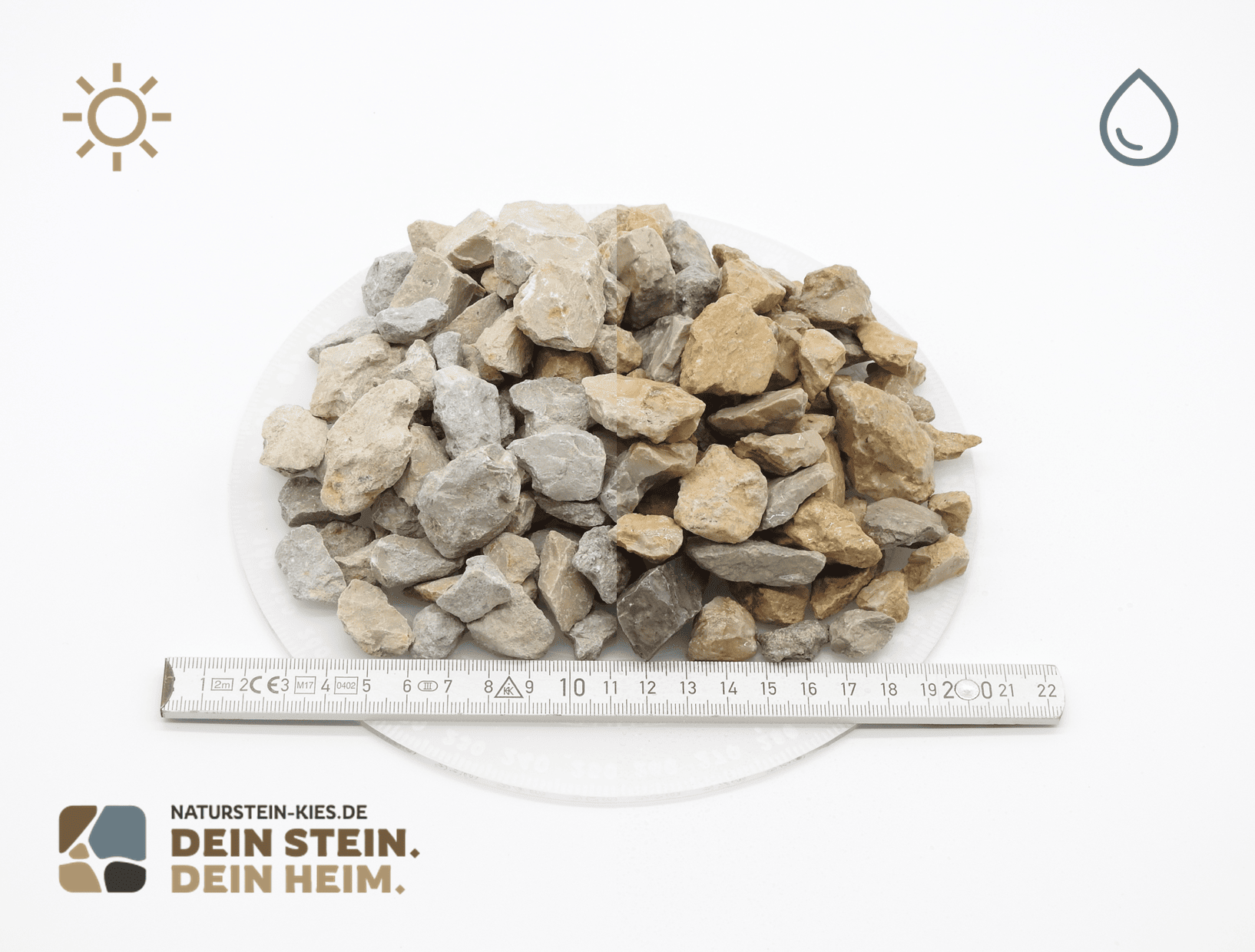 Schüttgutprodukte, wie beispielsweise Kies oder Splitt, werden oft in ihrer natürlichen Form angeboten. Diese Materialien sind in der Regel nicht gewaschen und können Anteile von Unter- und Überkorn sowie Gesteinsstaub enthalten. Daher empfehlen wir, das Material vor der Verwendung mit Wasser abzuspritzen, um unerwünschte Staubpartikel zu entfernen und die Sichtbarkeit der Farben zu verbessern.
