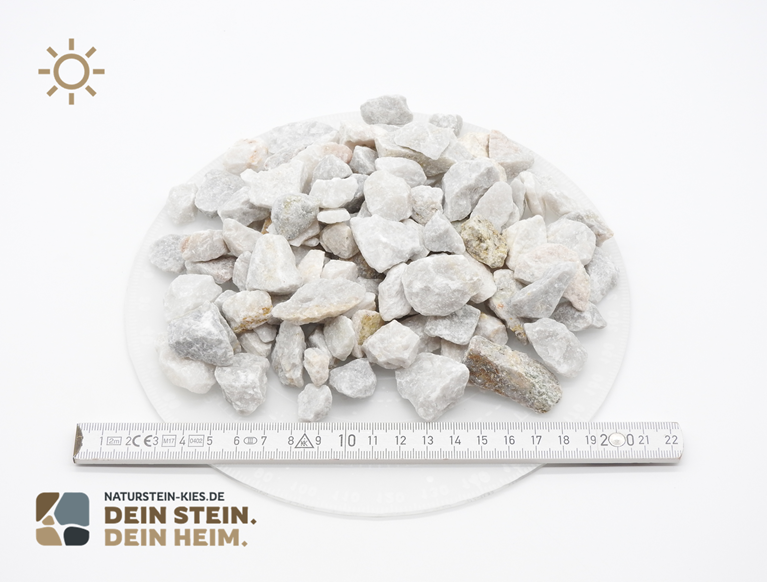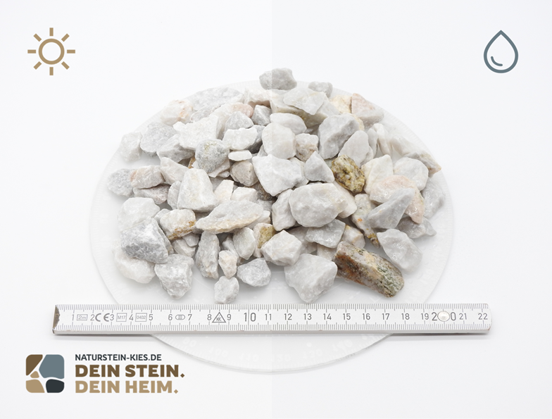 Marmor Splitt ist ein attraktives Material, das durch seine naturweiße Farbpalette überzeugt. Die Steine variieren in den Tönen von reinweiß bis gräulich-weiß, was ihnen ein besonders natürliches Aussehen verleiht und es ihnen ermöglicht, sich harmonisch in jede Umgebung einzufügen. Die glitzernden Partikel reflektieren das Sonnenlicht und schaffen eine angenehme Atmosphäre, die zum Wohlfühlen und Träumen einlädt.
